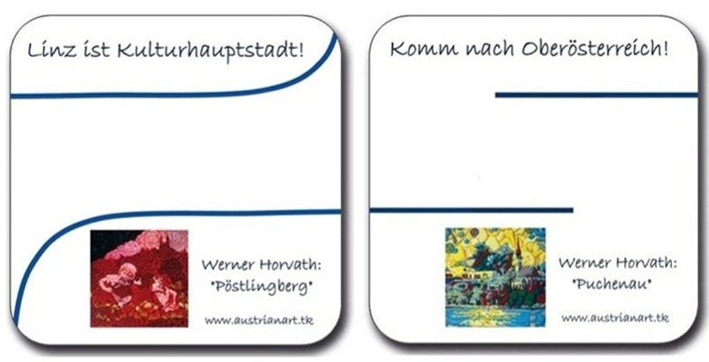 "Linz ist Kulturhauptstadt!" und "Komm nach Oberösterreich!". 2 Bierdeckel für Linz 2009.