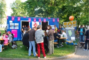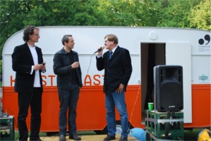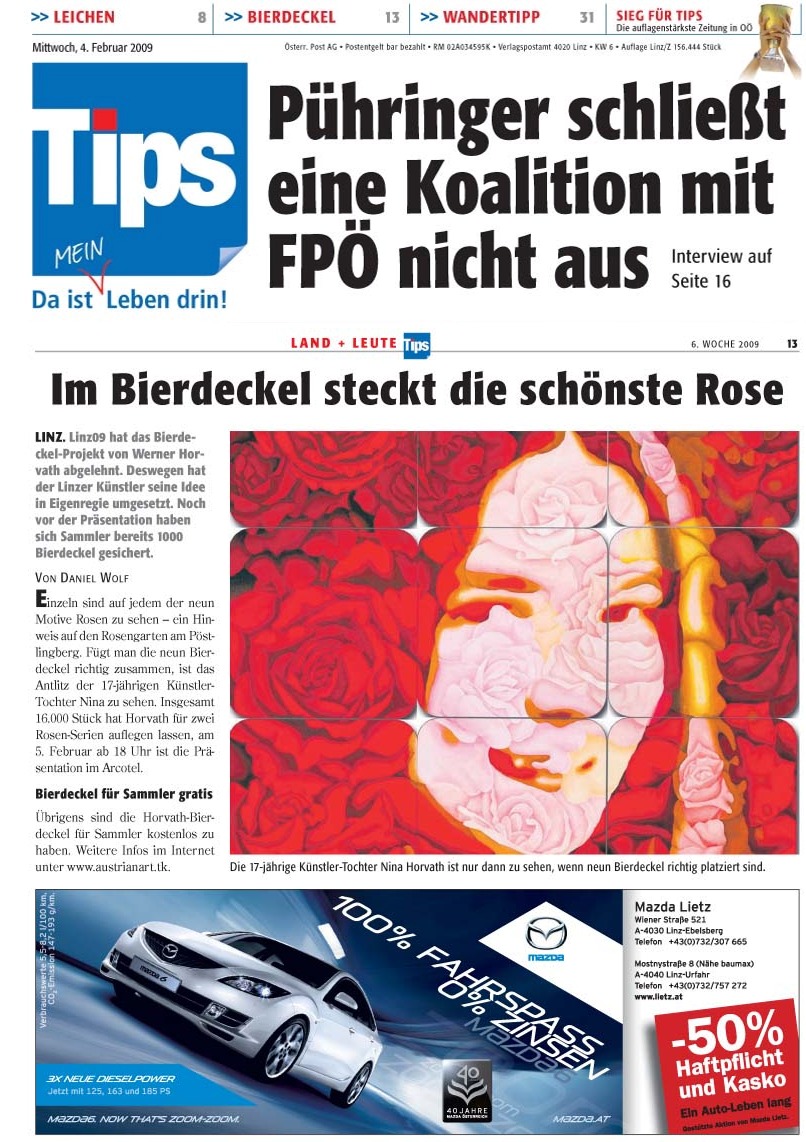 Unter dem Titel "Rosiges Linz" wurden die Bierdeckel am 2.5.2009 bei der Übergabezeremonie zwischen den Kulturhauptstadtteilen Dornach-Auhof und Neue Innenstadt im offiziellen Linz-09-Projekt "Kunstpalast" im Linzer Volksgarten erneut vorgestellt. Auch das "Model" für das Motiv, Nina Horvath, war anwesend (2.Reihe, links unten). Es wurde ausgiebig erläutert, diskutiert und gefeiert: