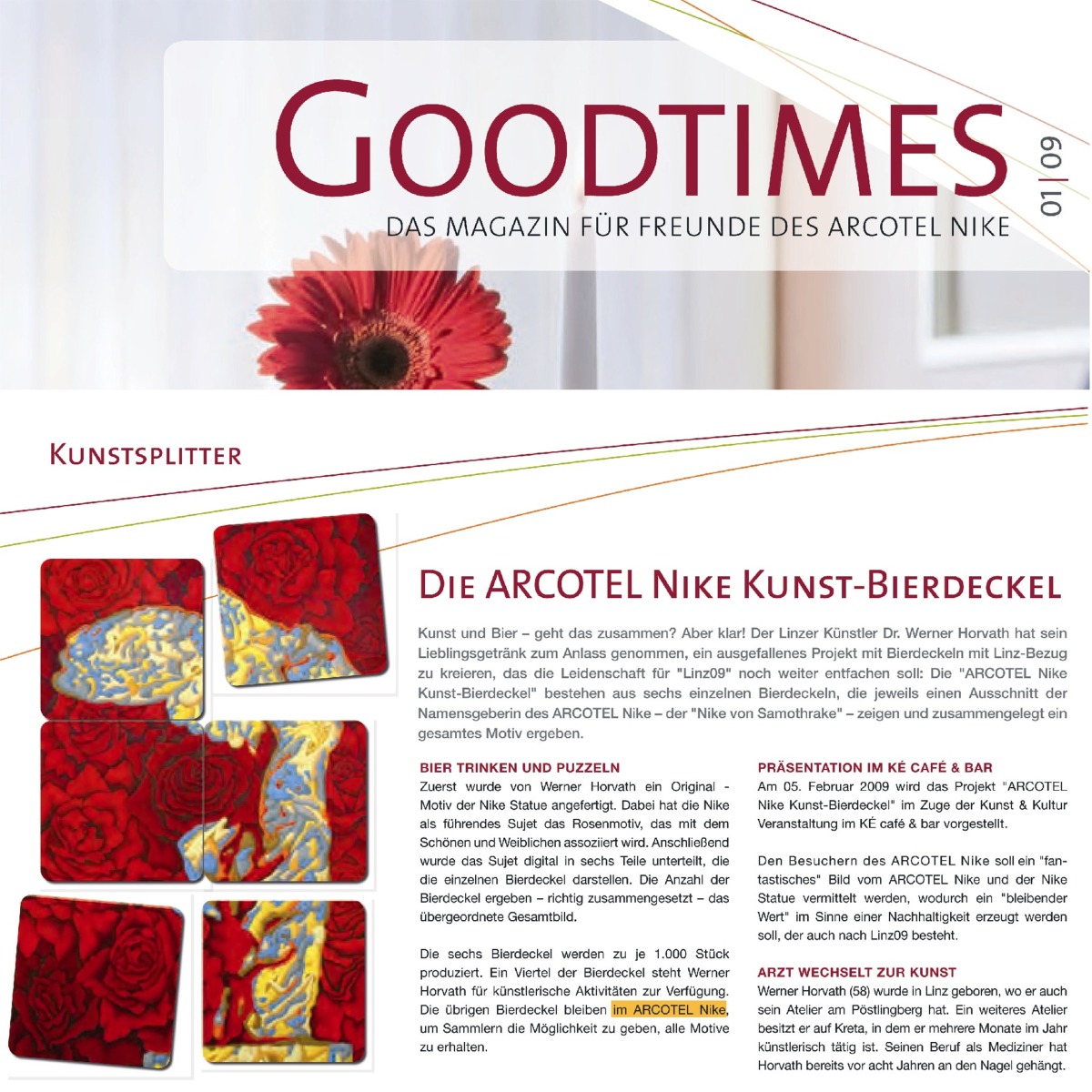Unter dem Titel "Rosiges Linz" wurden die Bierdeckel am 2.5.2009 bei der Übergabezeremonie zwischen den Kulturhauptstadtteilen Dornach-Auhof und Neue Innenstadt im offiziellen Linz-09-Projekt "Kunstpalast" im Linzer Volksgarten erneut vorgestellt. Auch das "Model" für das Motiv, Nina Horvath, war anwesend (2.Reihe, links unten). Es wurde ausgiebig erläutert, diskutiert und gefeiert: